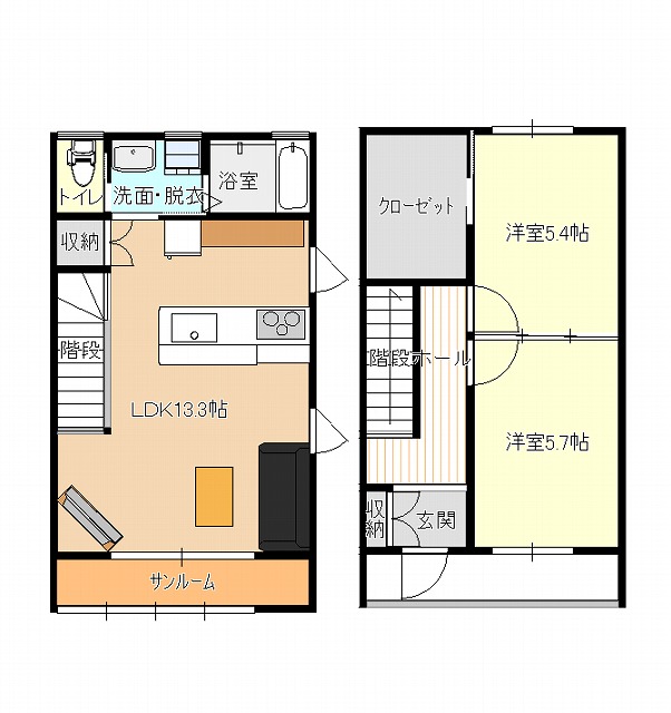 | 間取内容 | 2階LDK13.3帖 1階洋室5.4帖 1階洋室5.7帖 |